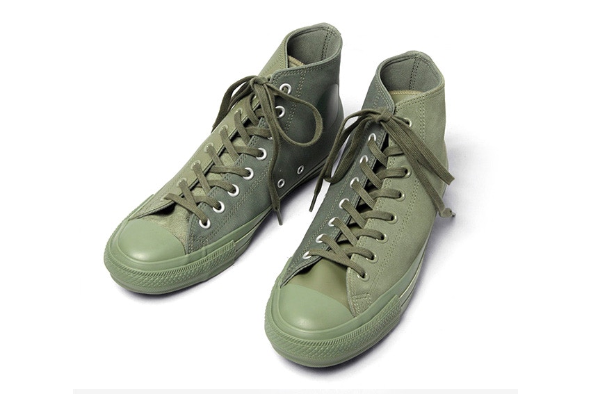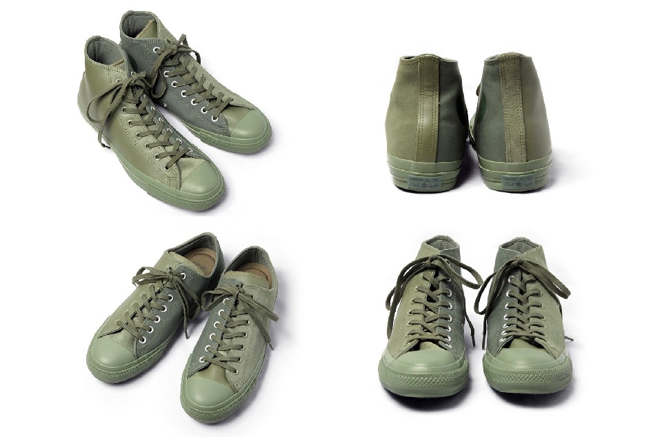 Engineered Garments e Converse collaborano per realizzare una variante nuova delle All-Star. Queste scarpe, disponibili sia nella variante a collo alto che a collo basso, esibiscono una costruzione asimmetrica che mischia pelle scamosciata, ecopelle e tela separando longitudinalmente il profilo per mezzo di materiali diversi in aree nette. La colorazione scelta per questa versione è il verde oliva con toni monocromatici per ogni materiale utilizzato, sfruttando tonalità differenti del medesimo colore per ogni zona. Disponibili già da subito, ma per ora solo in territorio asiatico.