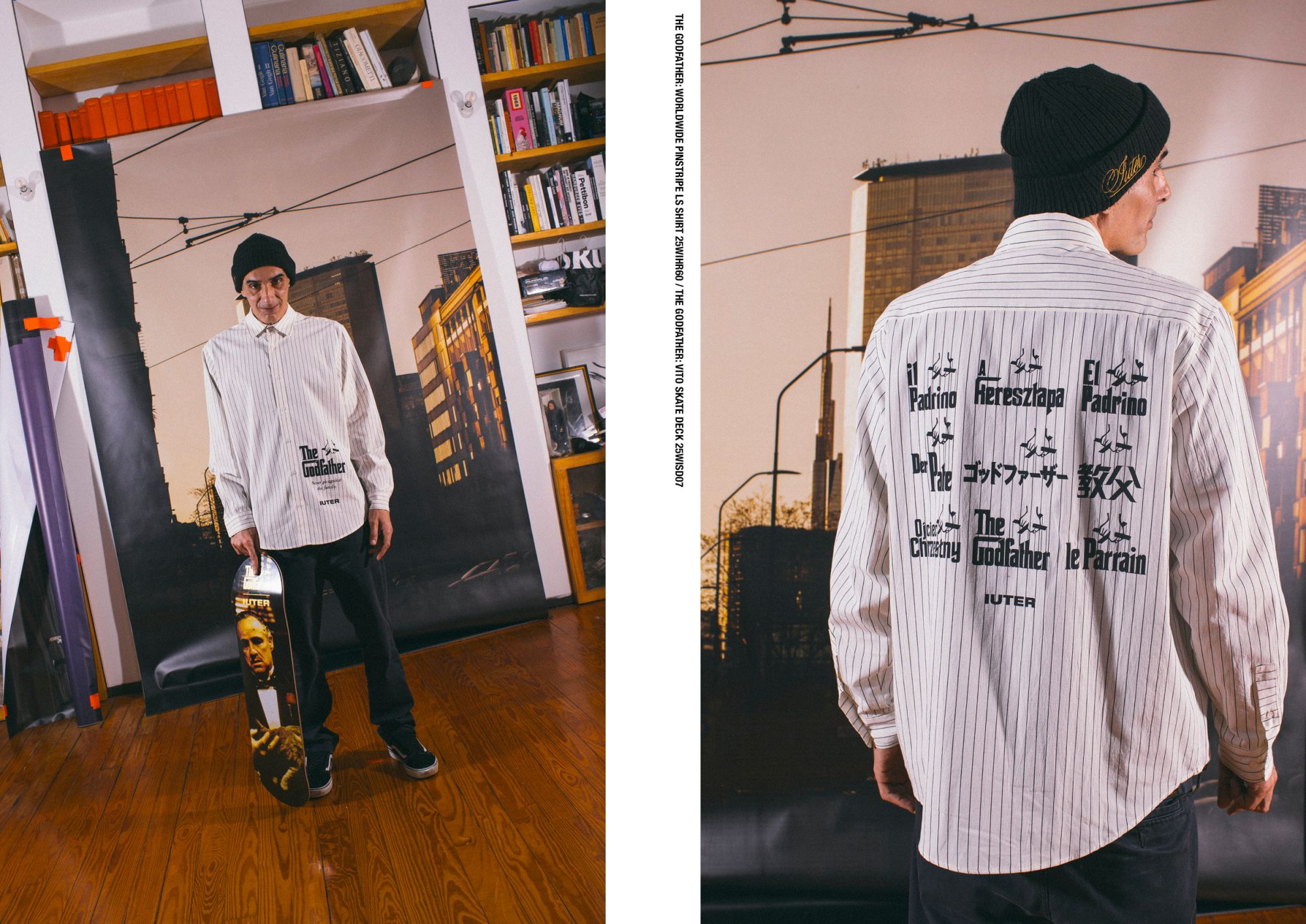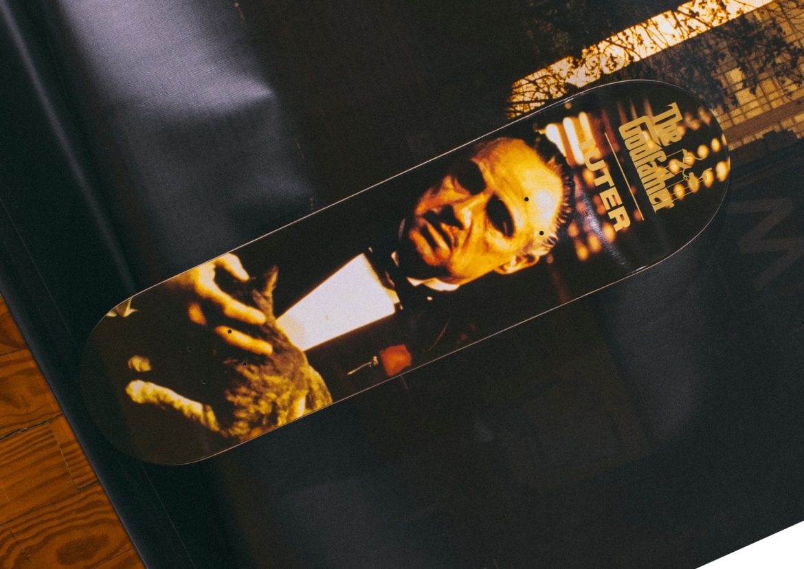 All’interno della FW25 spicca una capsule dedicata a “The Godfather”, che porta l’iconografia cinematografica nel mondo streetwear attraverso hoodie, t-shirt, jacket e persino skateboard. Un progetto che rafforza il legame di IUTER con la cultura pop e urbana, andando oltre la semplice moda.