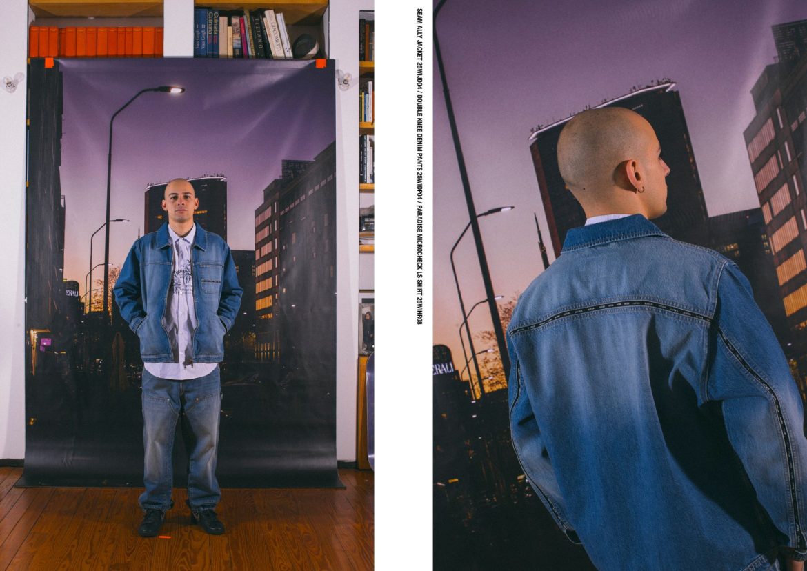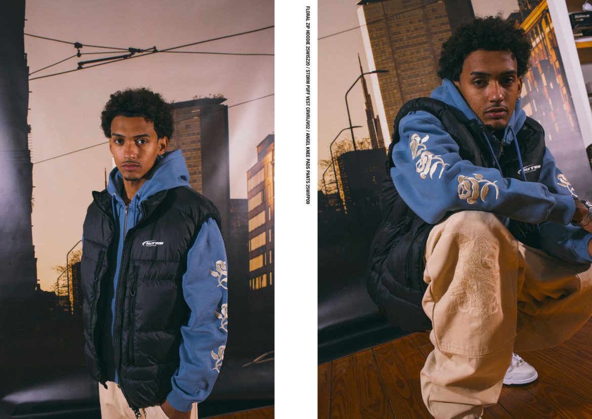 La palette cromatica è dominata da toni urbani e naturali come nero, asphalt, earth, cream e ice, con accenti più vivaci come pink, yellow e burgundy a spezzare la continuità visiva. I materiali spaziano dal cotone heavyweight al denim, dal ripstop ai tessuti tecnici imbottiti, garantendo solidità e comfort per tutta la stagione.