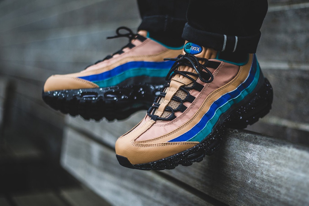 La colorazione Praline & Turbo Green rende le Air Max 95 Premium perfette per i mesi invernali. La scarpa alterna colori caldi e freddi, nello specifico utilizza beige e rosa per la parte superiore e ciano e blu per quella inferiore, con l’intersuola nera macchiata con punti bianchi a chiudere il tutto. La finta pelle è il materiale utilizzato per queste sneakers della Nike, dove trovano posto le unità Air in fondo alla suola per ottimizzare il comfort. Disponibili online già da subito presso i migliori retailer.