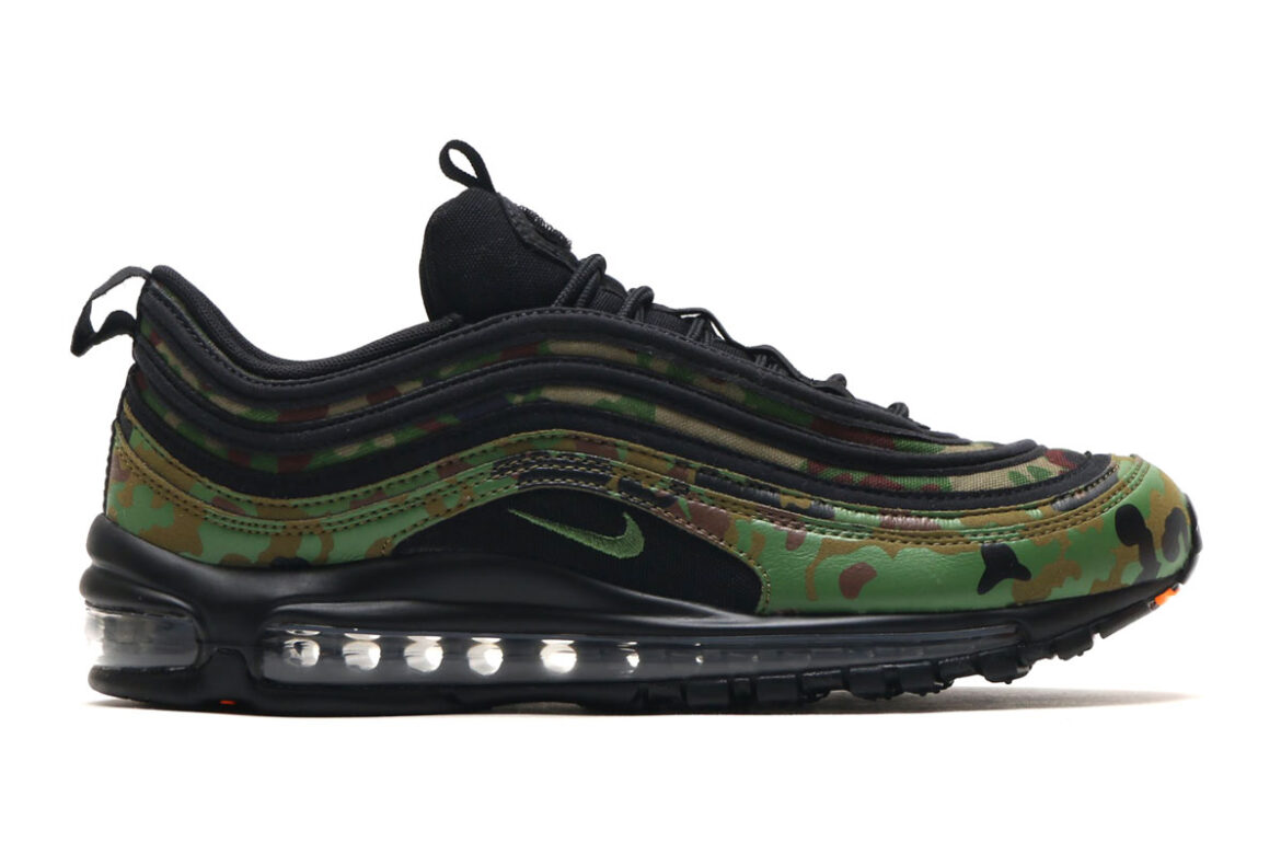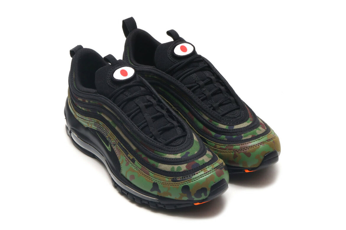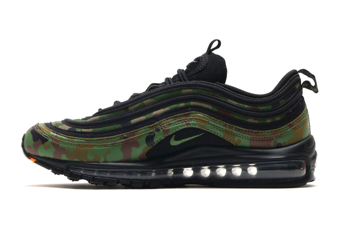 Questa versione in edizione limitata delle Air Max 97 della Nike mostra una camuffatura forestale e accenti arancioni. La silhouette delle Air Max 97 è stata decorata con una mimetica ispirata alle forze speciali giapponesi di colore verde, marrone e nero, costruita in pelle e tela e con la suola di colore nero con dettagli di un colore denominato per l’occasione “Hazard Orange“. La classica intersuola delle Air Max 97 è in silicone trasparente e lascia intravedere attraverso le camere. In vendita solo in territorio nipponico a partire da oggi 9 Dicembre.