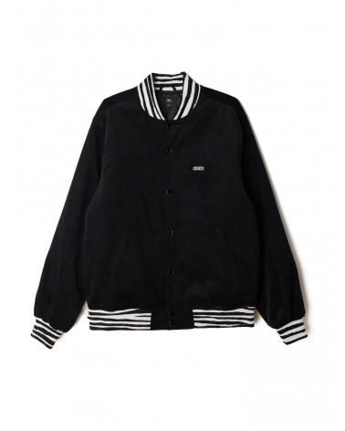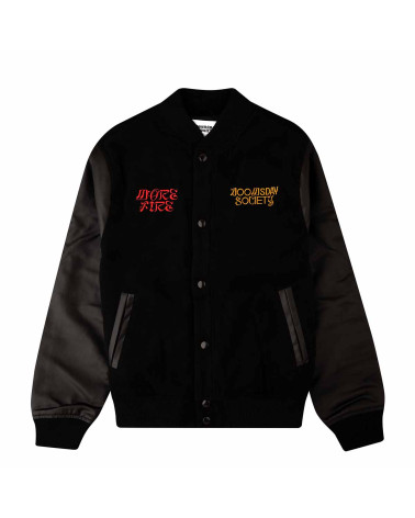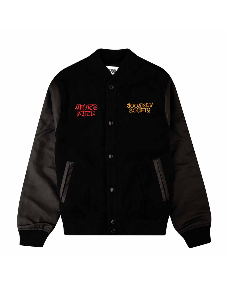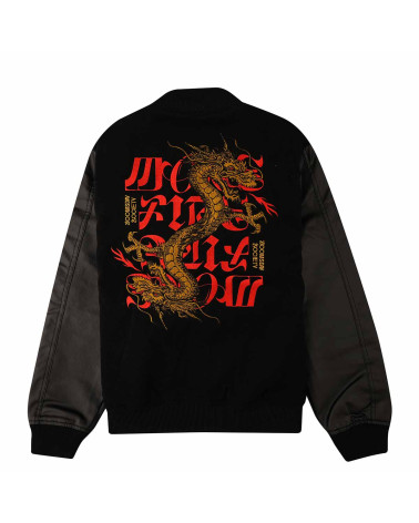 Giacca stile college di Doomsday, chiusura con bottoni, tasche laterali. tasca interna, rivamo sul perro, ricamo sulla schiena, interno imbottito con cuciture quilted. Maniche in Eco pelle
