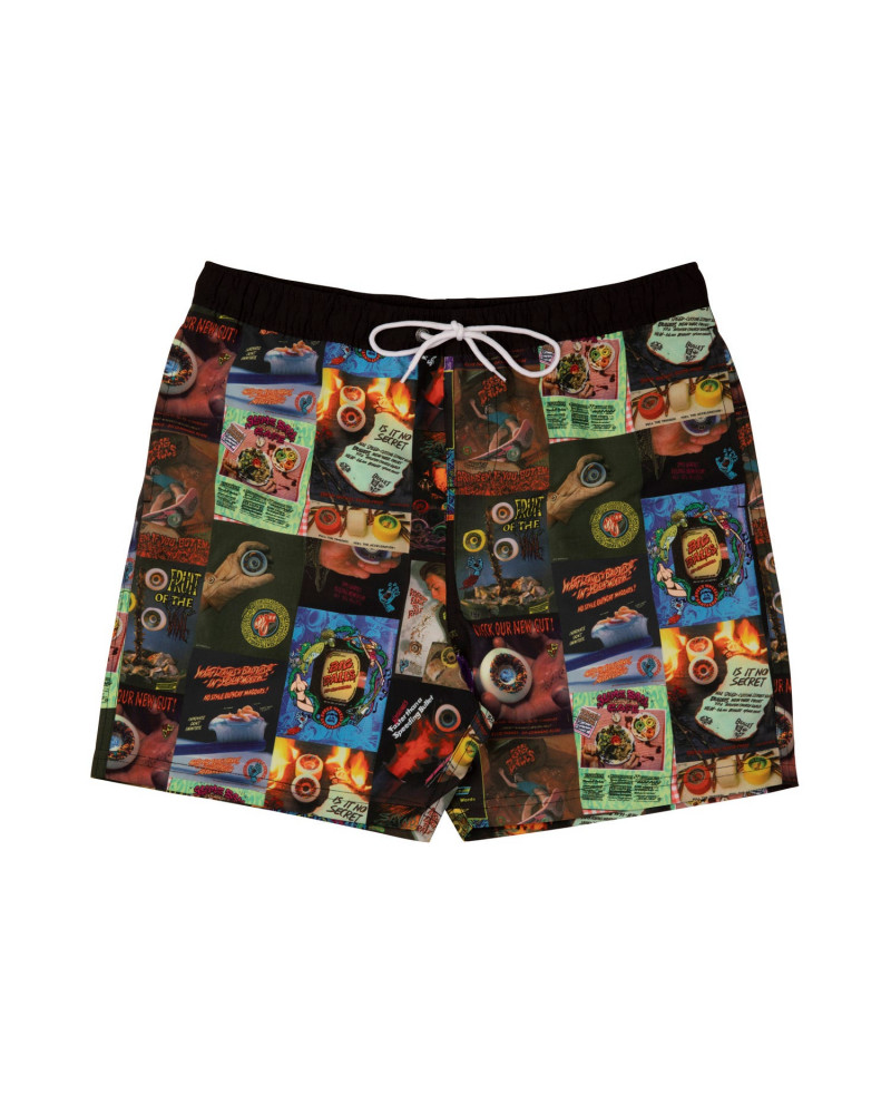 100% polyester, peach micro fibre, elasticated waist swimshort with 17" outseam, mesh lining, side pockets and back pocket, all over print and print at back pocket