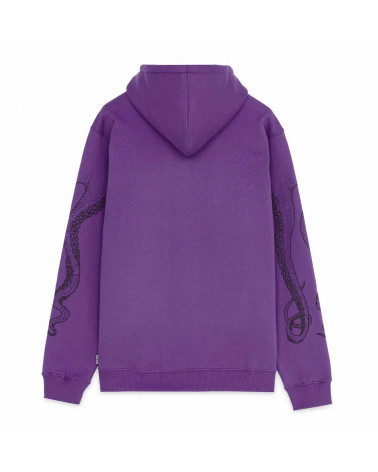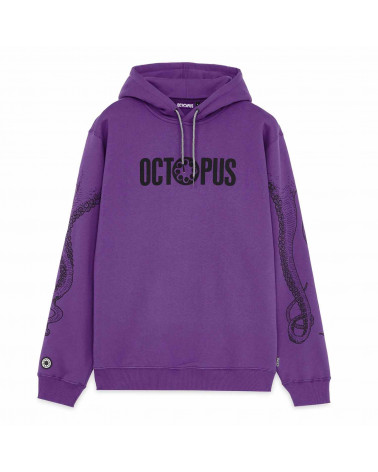 Felpa con cappuccio viola. Stampa logo sul fronte e tentacoli sul retro.