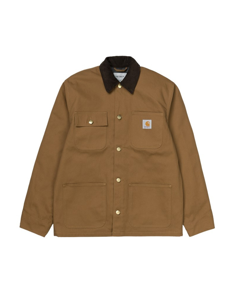 La Michigan Coat è una classica giacca da lavoro realizzata nella nostra esclusiva e resistente tela Dearborn, ora prodotta in cotone biologico. Bottone e rivetto a contrasto ispirati ai classici modelli da lavoro. Presenta una calda fodera a righe, colletto in velluto e la classica etichetta in tessuto Carhartt WIP sul lato sinistro del petto.