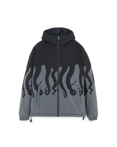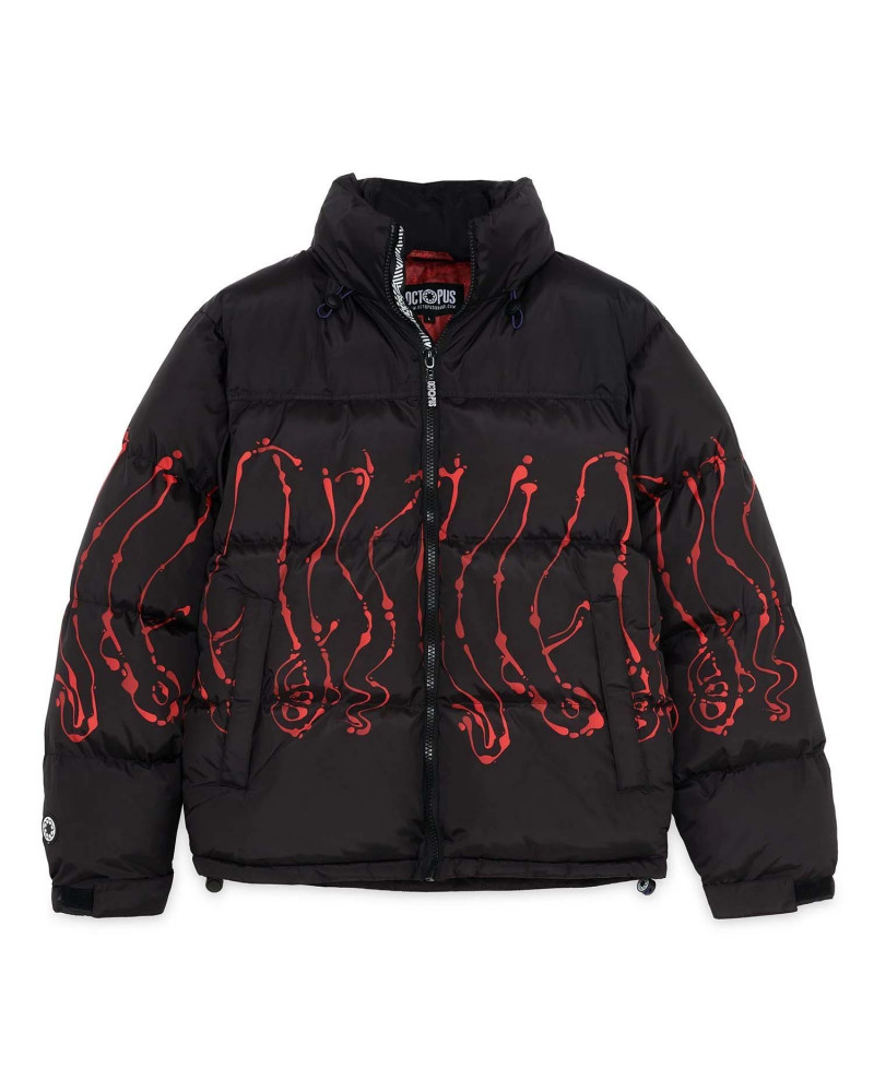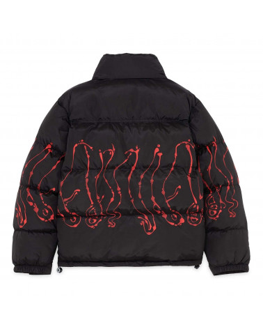 Piumino nero con stampa tentacoli rossa a contrasto. Garantisce estremo calore grazie all'imbottitura EcoDown, alternativa alla piuma ecosostenibile e capace di mantenere performance elevate anche con il passare del tempo.