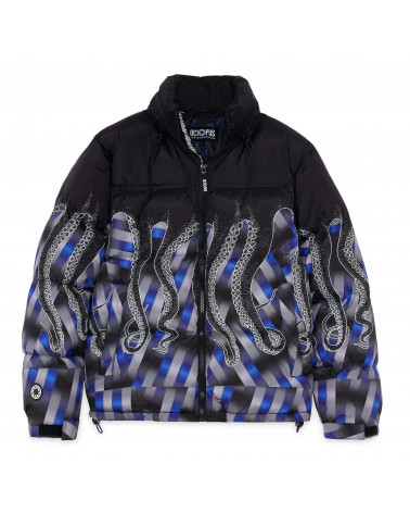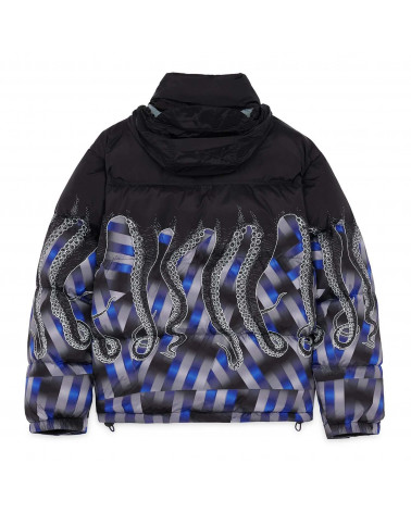 Piumino nero con stampa tentacoli. Garantisce estremo calore grazie all'imbottitura EcoDown, alternativa alla piuma ecosostenibile e capace di mantenere performance elevate anche con il passare del tempo.