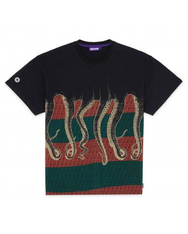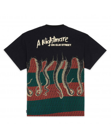 Omaggio a Nightmare - Dal profondo della notte. A quasi quarant'anni dal primo capitolo, Freddy Krueger è ancora l'uomo nero definitivo. Questa t-shirt nera è ovviamente ispirata al suo iconico maglione a strisce orizzontali.